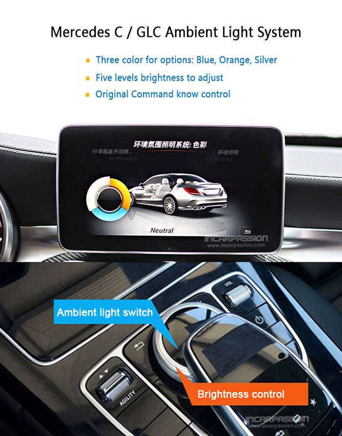 For C Class W205 and GLC without original ambient light, can install 64 colors ambient light(need to install the light kit + hardness kit);